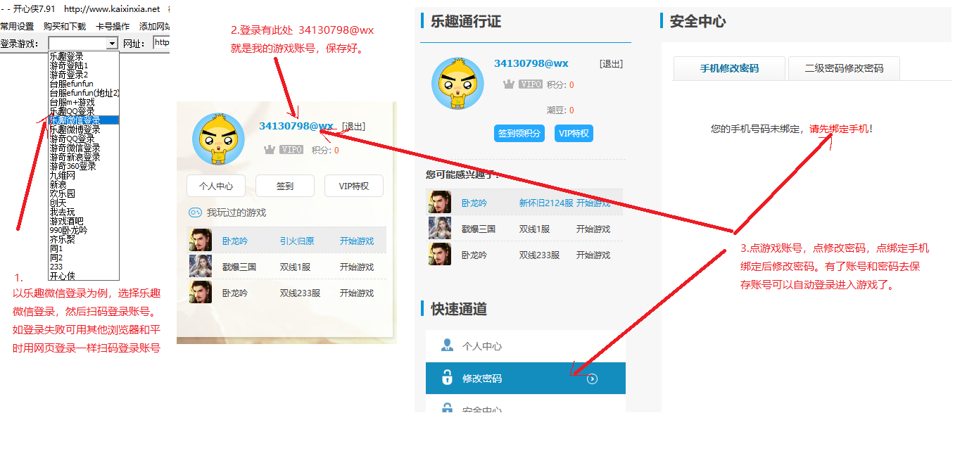 ④.获取户中心显示的账号(注意不是QQ号)和修改后的密码后选择乐趣(游奇)账号登录